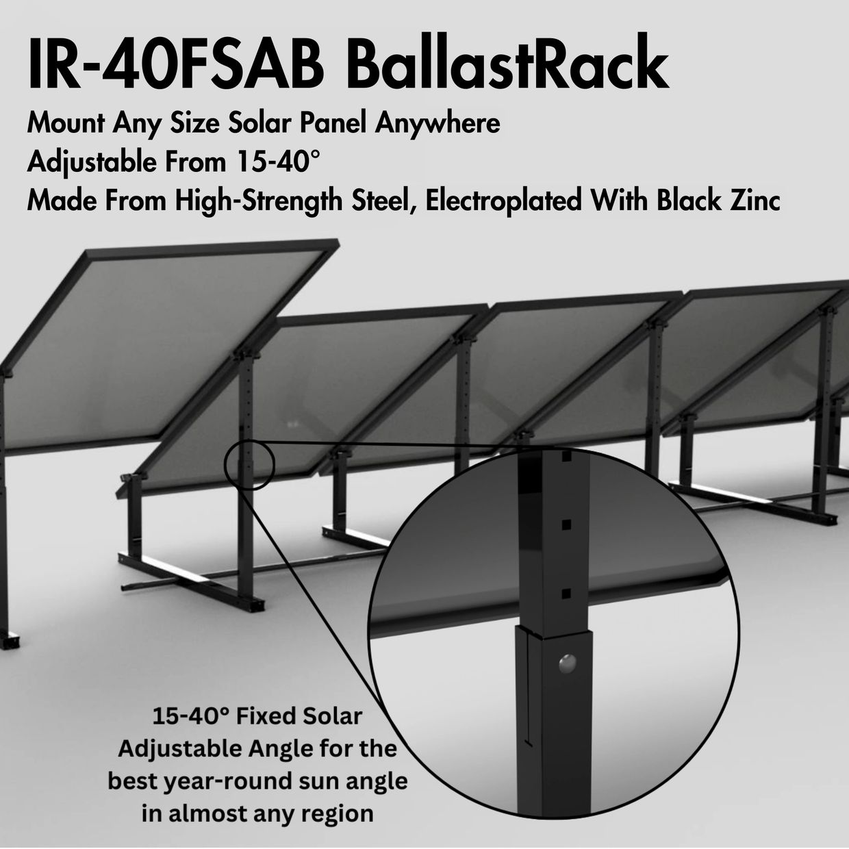 The IR-40FSAB is constructed from black zinc plated high-strength steel and offers all of the same great features of our other BallastRack systems with the ability to be set closer to the exact angle needed for maximum performance in your region. This system is designed to rack solar modules of any size, even 800 Watt jumbo size solar panels are no match for the IR-40FSAB. With multiple innovative mounting options available to choose from, even soft sand or super rocky terrain is no problem at all for lightning-fast install times. Each IR-40FSAB frame can be assembled in less than 2 minutes, and with its unbelievable ability to rack modules of any size, this system is by far the most cost-effective adjustable ground mount racking system on the market today. Unlike some ground mounting systems, the IR-40FSAB doesn't require any concrete footings, post pounded poles, or hand shoveling dirt into small bins. The 15-40° adjustable angle can be set to offer optimal year-round energy production across most regions around the world, and with its easy to slide adjustable solar module height feature, it offers great ground clearance and a great angle for fast snow shedding. With extensive lab testing and engineering, and backed by a 25 year limited product warranty, this system is perfect for any project.